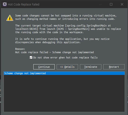 The current target virtual machine [spring.config.SpringBootMain at localhost:50245] from launch [ACMS - springBootMain] was unable to replace the running code with the code in the workspace.